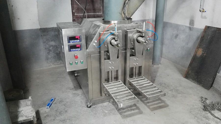 將閥口包裝袋套在加料嘴上,按動“允加”按鈕,這時壓袋氣缸開始工作并壓住袋口,控制器將包裝袋重量自動去除,破拱電機緩慢轉(zhuǎn)動,保證下料暢通。加料螺旋高速轉(zhuǎn)動迅速將物料灌入袋中,隨袋中空氣一起溢出的粉塵通過吸塵器由除塵器吸走,振動裝置同時啟動將托盤上袋中物料振實充滿袋角。待加料快到設定值時,加料螺旋進行減速慢加,到設定值時,加料停止。誤差<0.3%。這時壓袋氣缸松開袋口,翻袋氣缸將托盤翻轉(zhuǎn),將物料翻倒在皮帶輸送機上及時送出。