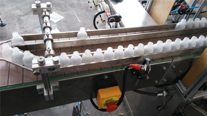 有輸送機將瓶子轉入灌裝位,自動灌裝,灌裝后再自動進入旋蓋,當瓶子轉到自動封蓋過程中,瓶口碰蓋,后面從蓋槽中滑出一個瓶蓋在瓶口上,