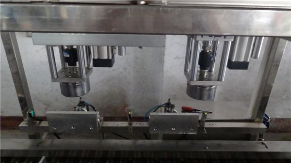 設備將灌裝好的罐,由輸送帶將罐輸送到鎖蓋位置,檔塊檔住罐,使罐定在鎖蓋位,再有理蓋機將蓋子整理并落到罐口上,鎖蓋頭自動下降,使蓋