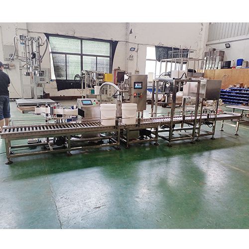 人工上桶,自動輸送,自動貼標,自動對口,自動灌裝,自動放蓋,自動壓蓋,自動輸送,人工碼垛