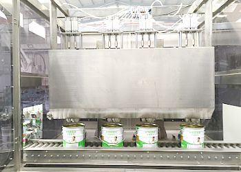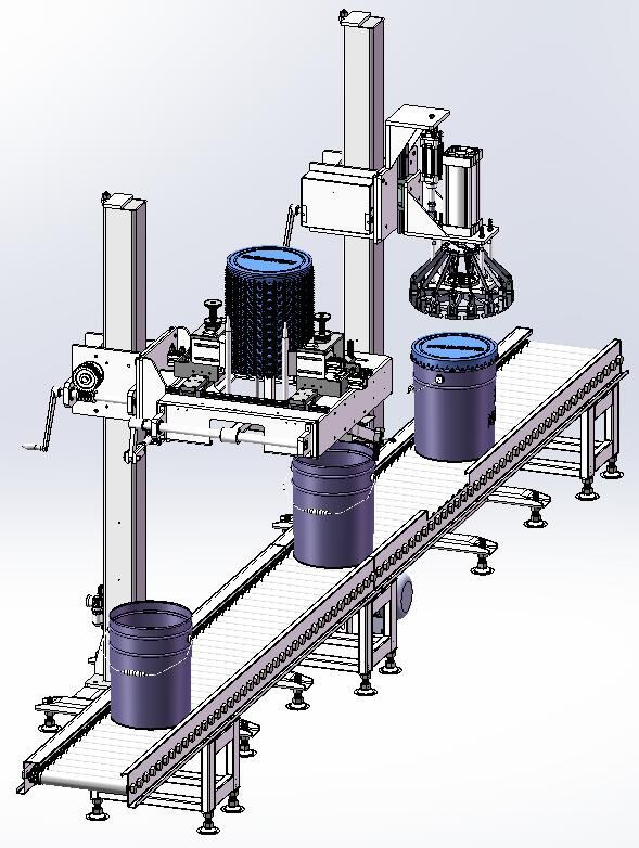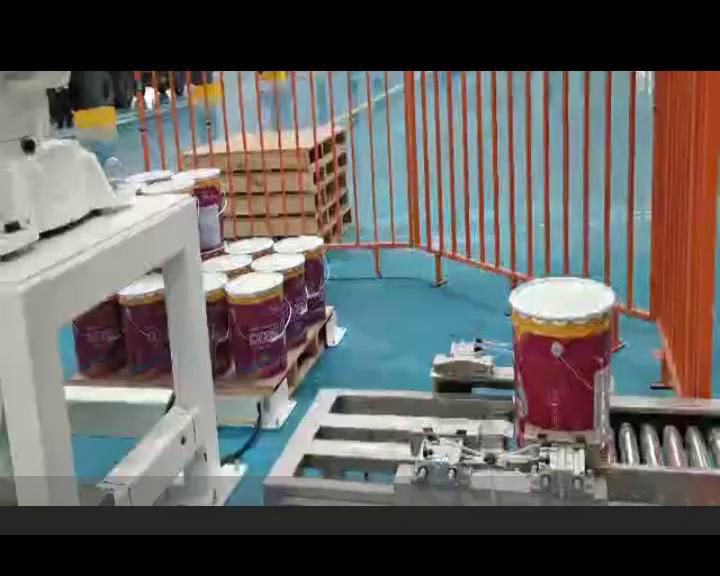 全自動桶裝生產線:包括自動臥式分桶、4頭自動定量灌裝、自動分蓋上蓋封口、機器人自動碼垛整條全自動生產線