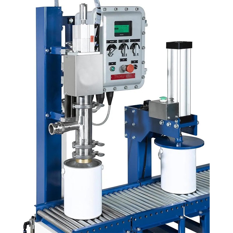 ■ 在灌裝系統的控制下,灌裝自動定位找到桶口,灌裝頭自動插入桶口,并將空桶自動去皮,系統打開球閥,進行大中小料三段式灌裝;