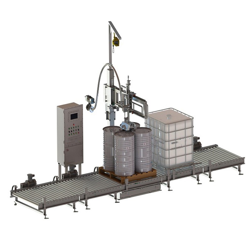 操作流程:人工上桶→人工對孔→自動灌裝→人工放蓋壓蓋→移載滿桶→人工碼垛;