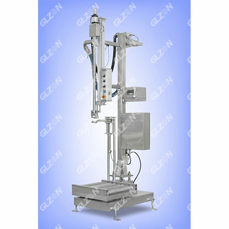 灌裝結束,灌裝秤頭自動提升至桶外,滴漏盤自動接至灌裝頭底部灌裝完成,輸送線啟動自動將成品桶輸送至鎖蓋區,人工鎖蓋完成自動輸送至成品區,叉車叉走成品桶整個灌裝流程結束!