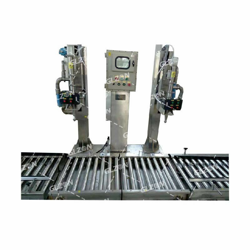 工作流程:空桶自動輸送 - 空桶撥至稱重區(qū)同時自動對桶口 - 空桶自動除皮 - 自動定量灌裝 - 自動推重桶至鏈板輸送線 - 自動上蓋同時自動鎖蓋 - 重桶輸送到重桶待提區(qū) - 人工提走即完成