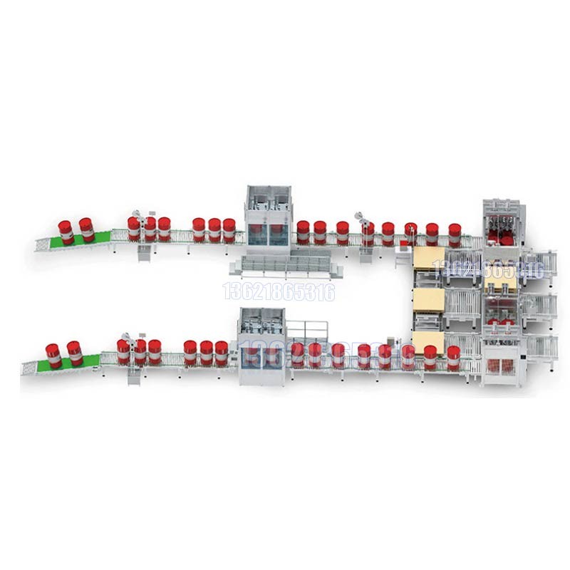 全自動液體灌裝機生產線是一種高度自動化的液體灌裝設備,廣泛應用于食品、飲料、醫藥、化工等行業。它由一系列單機組成,如理瓶機、灌裝機、旋蓋機、鋁箔封口機、不干膠機等,實現液體的自動灌裝、封口和包裝等功能。以下是全自動液體灌裝機生產線的主要特點和組成部分:
