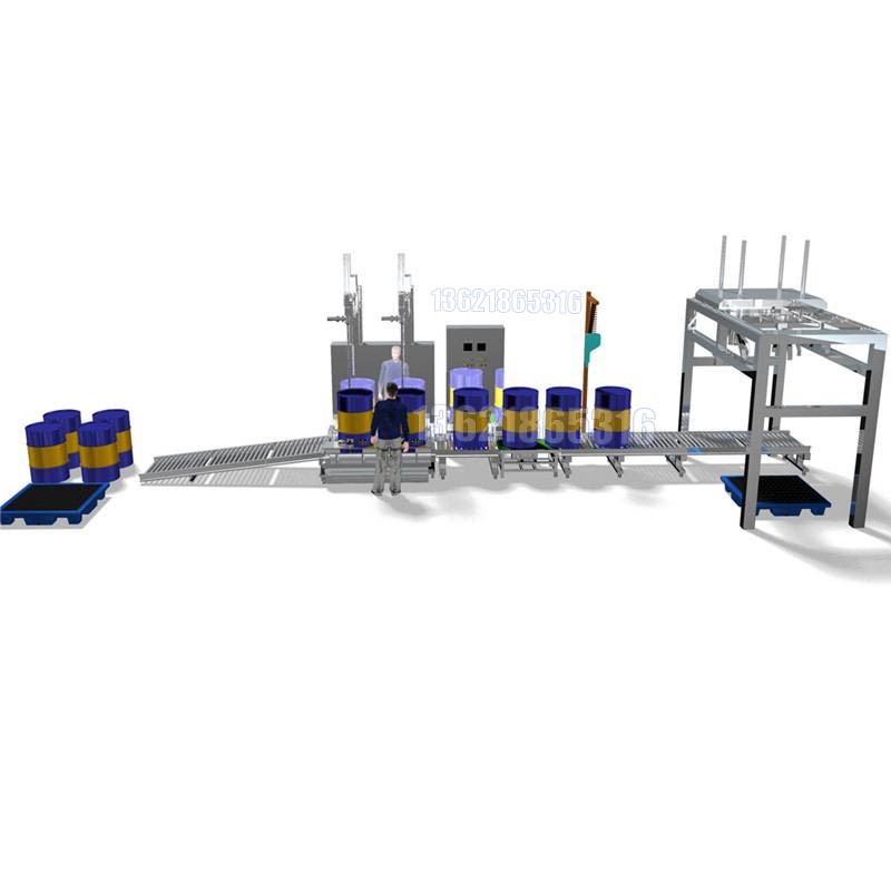 灌裝機操作流程:人工放桶,[啟動]按鈕,自動去皮。然后打開灌裝頭閥門,精確地雙速灌裝;灌裝結束,灌裝頭閥門自動關閉,人工將桶推出磅臺上蓋壓蓋即告完成。
