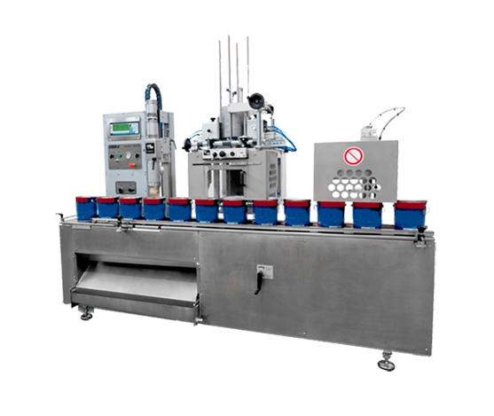 Automatic machine for the filling and closing of small/medium cans (rectangular or cylindrical, opened), for small batches.