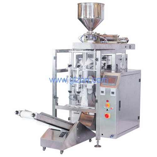該立式制袋全自動包裝機械能完成計量,充填,打碼、制袋、切裝等工作。適用于膠水、乳液、涂料、膩子膏,豆沙、黃油等。