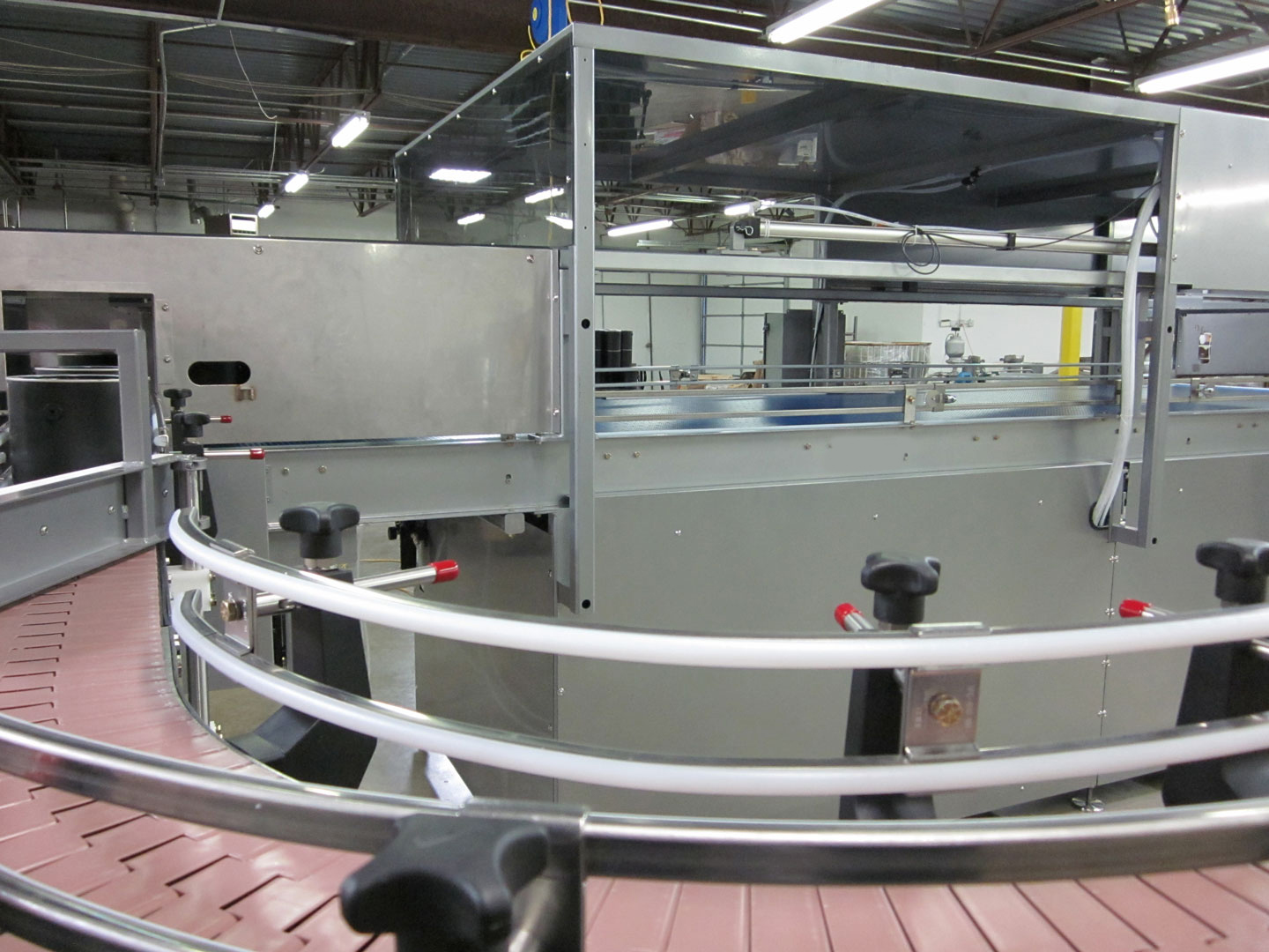 Depalletizer automatically indexes to the depalletizing station as needed. Adjustable from pint to 5 gallon containers.