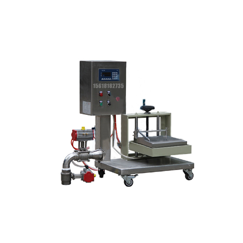 ■ 在灌裝系統(tǒng)的控制下,灌裝自動定位找到桶口,灌裝頭自動插入桶口,并將空桶自動去皮,系統(tǒng)打開球閥,進(jìn)行大中小料三段式灌裝;