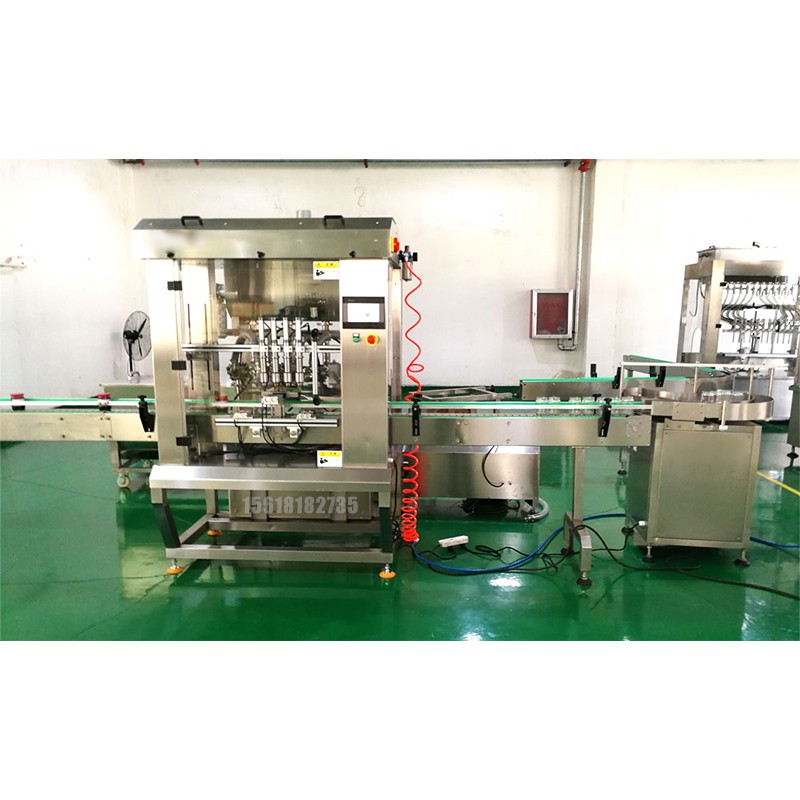 調味品自動灌裝生產線調味品自動灌裝生產線的主要組成設備:四頭醬料灌裝 機、真空旋蓋機、套膜收縮一體機、全自動圓瓶貼標機、收瓶機。大型醬料灌裝設備生產線所使用的四頭醬料灌裝機介紹:  四頭醬料灌裝機灌裝系統采用伺服電機速度同步跟蹤驅動,灌裝計量使用PLC自動處理系 統;計量調節直接從觸摸屏輸入而無須變動其它部件;采用先進的伺服驅動控制技術,通過脈沖電子控制下潛灌裝,將不銹鋼灌裝頭準確無誤的 送入容器
