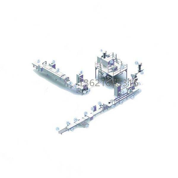 生產過程中實現(xiàn)秤重、供袋、取袋、裝袋、封袋、批號打印、倒袋整形、金屬檢測、自動剔除、重量復檢、自動剔除、輸送、機器人碼垛、空托盤配送、實托盤輸送、實托盤頂捆、托盤纏繞、實托盤輸出。