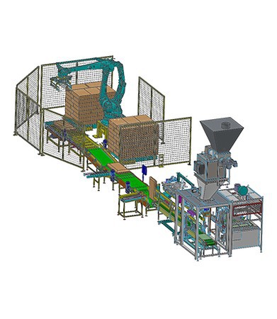 廣泛適用于顆粒、粉料、片狀料的全自動包裝碼垛一體機,由定量秤、供袋機、立袋輸送機、縫包熱合機、噴碼機、整形機、定位輸送機等組成。